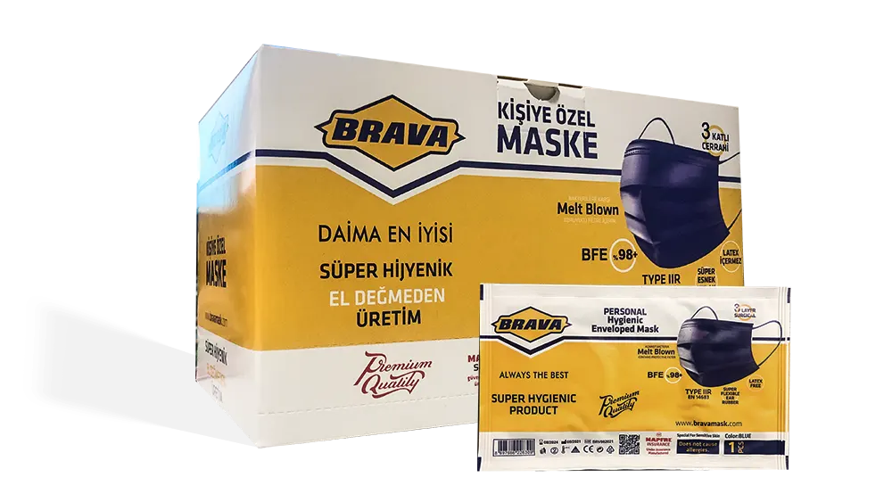 Ambalajında 2 adet maske bulunan özel paketli 3 katlı hijyenik maske, bireysel kullanım ve perakende için perakende satış. %98.5 BFE depolama oranı ile etkili koruma sağlar. Temassız üretim hattında üretilir ve tek ömürlüdür. Bulunan bilgiler, okullar ve kurumsal platformlar için pratik ve hijyenik bir çözümdür. Renk: Mavi. Paket: 50’li Kutu.